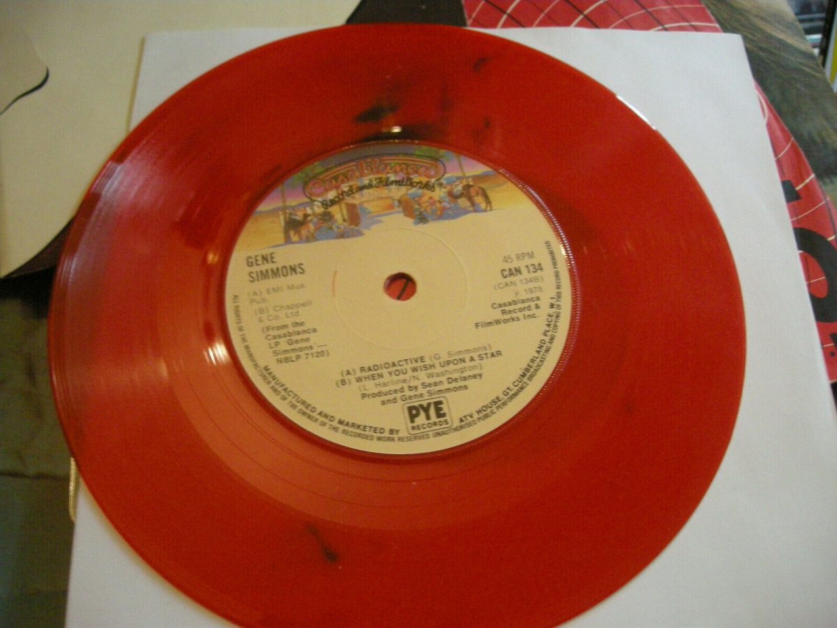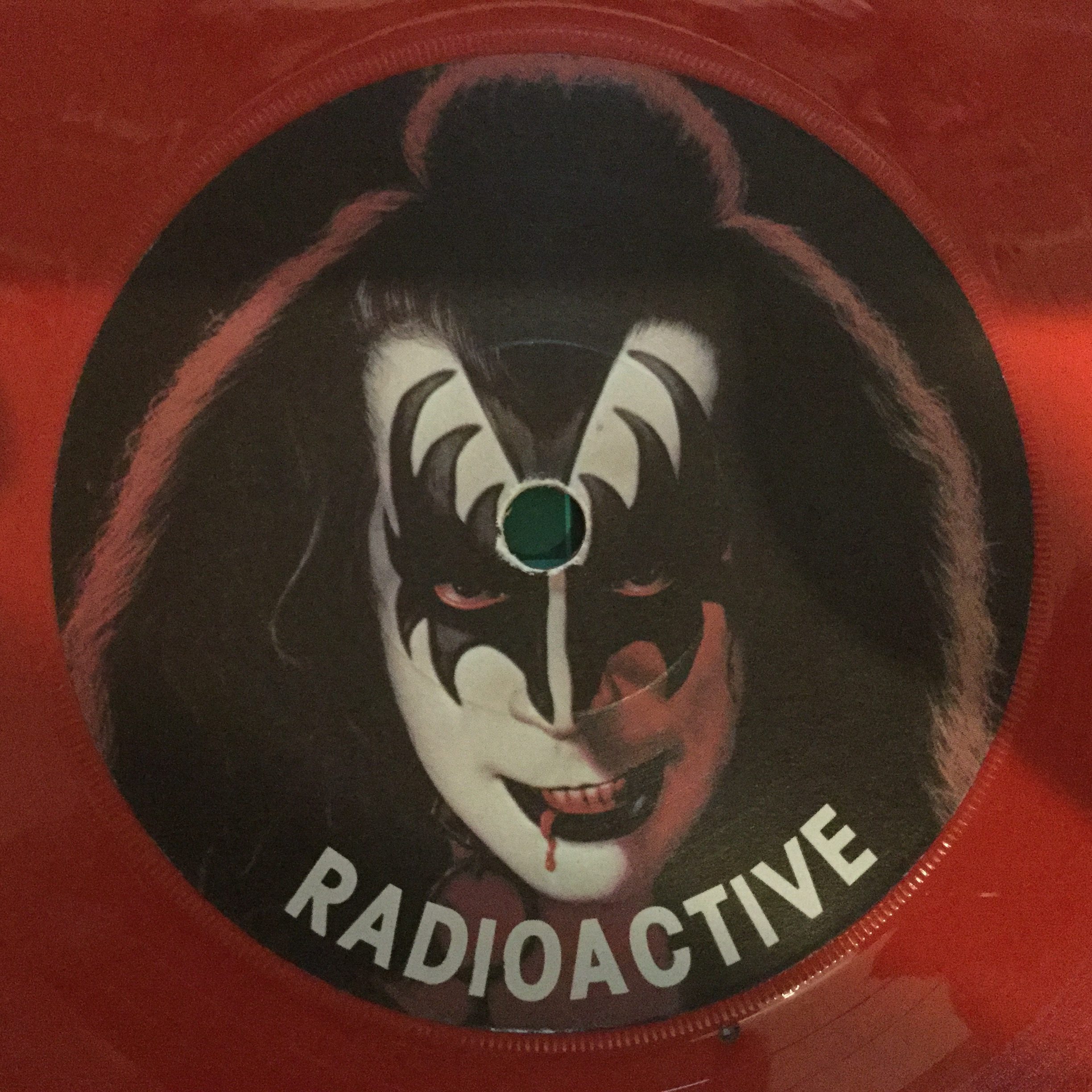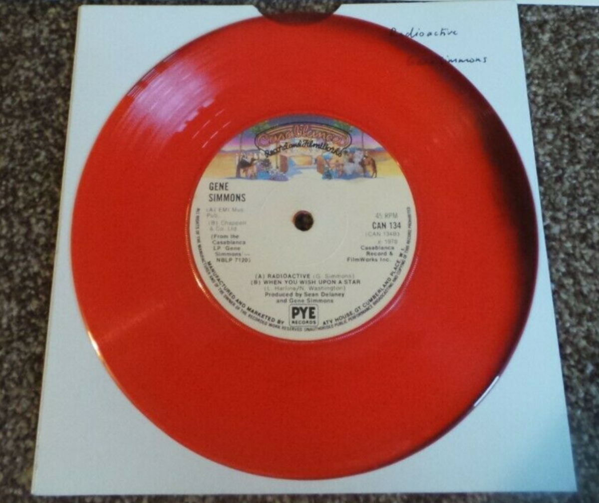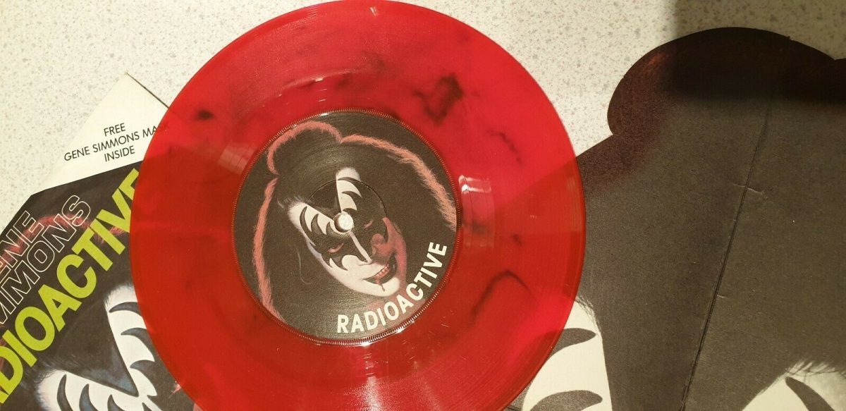 Without a doubt, the Gene Simmons “Radioactive” 7-inch is the most prolific single produced of the four and the one with the most variants out there, courtesy of PYE Records. With the corny pun of “Red-eoactive Vinyl” and the mask which was given the most pitiful haircut by PYE’s marketing designers, it certainly stood out from other Kiss releases. This page does not include ‘white label’ or test press versions of Radioactive (I know there is at least one white label version out there).