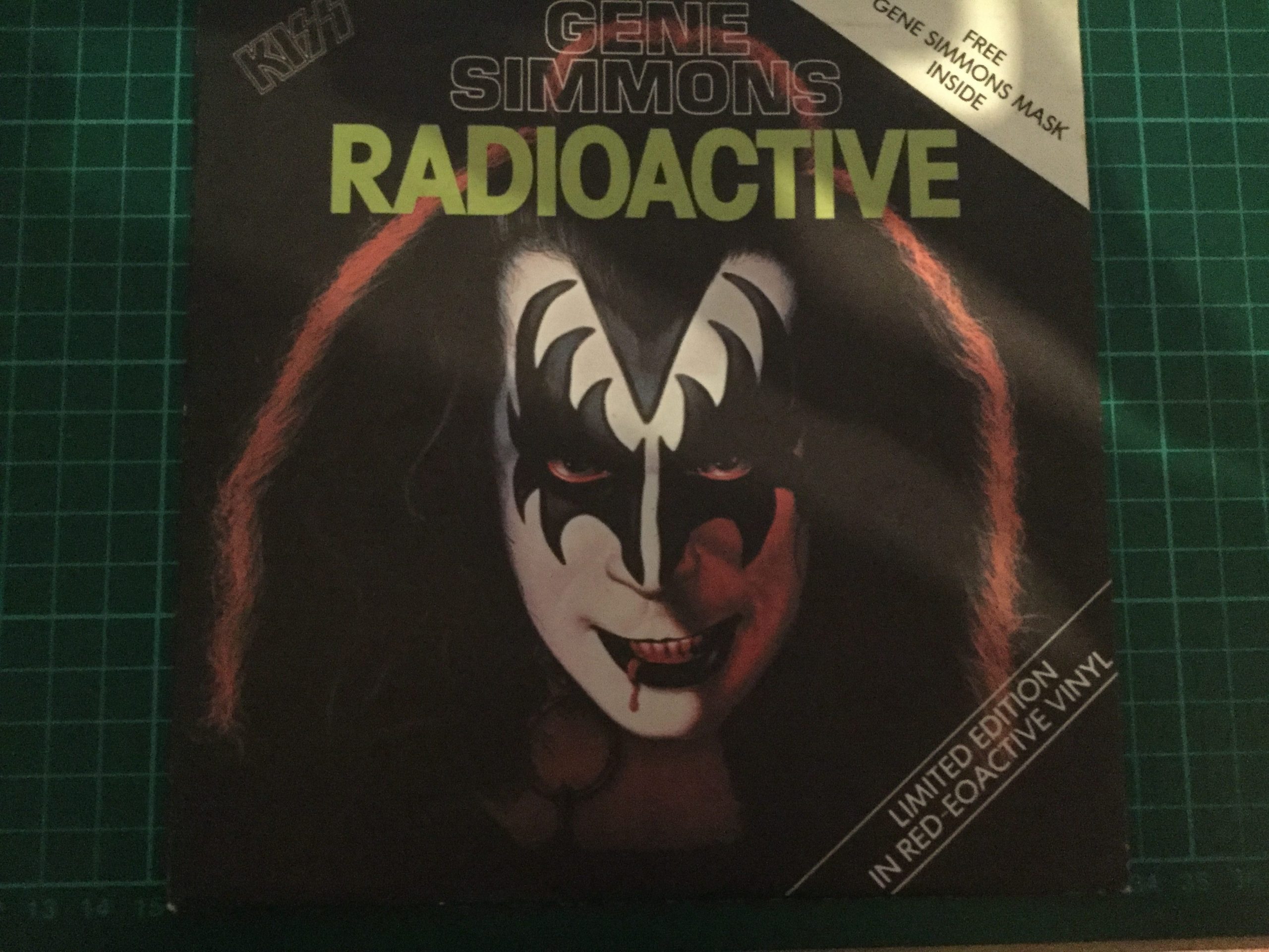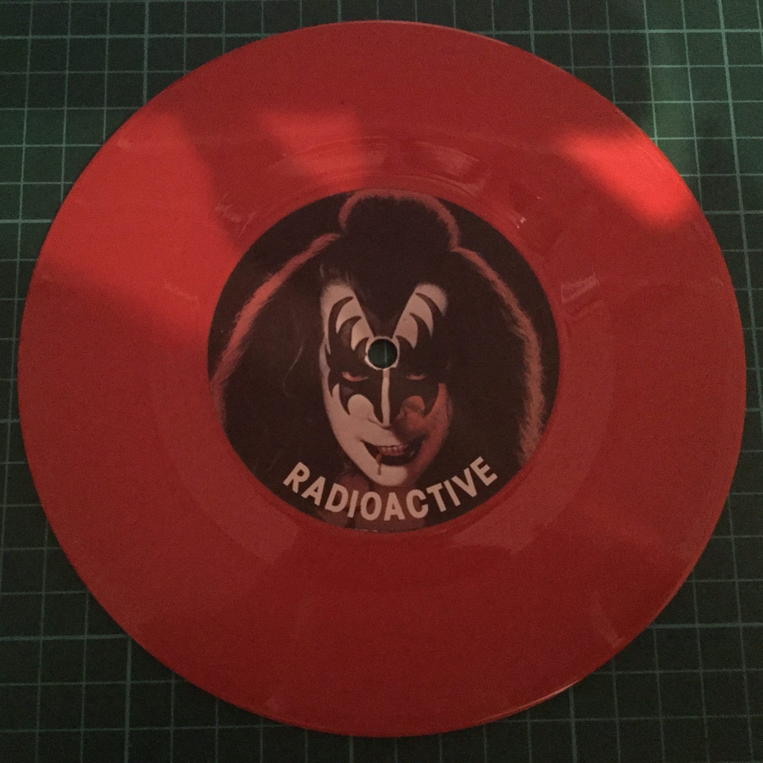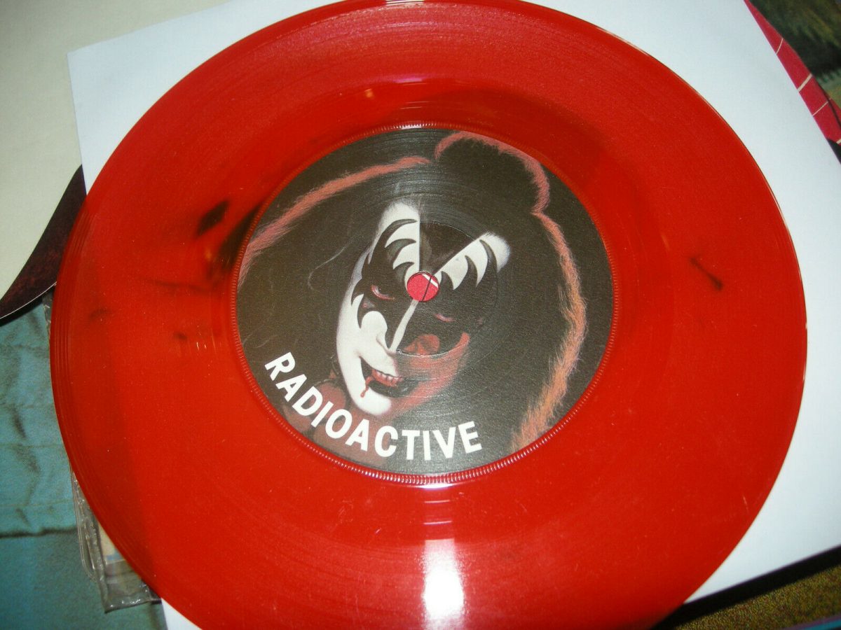 Without a doubt, the Gene Simmons “Radioactive” 7-inch is the most prolific single produced of the four and the one with the most variants out there, courtesy of PYE Records. With the corny pun of “Red-eoactive Vinyl” and the mask which was given the most pitiful haircut by PYE’s marketing designers, it certainly stood out from other Kiss releases. This page does not include ‘white label’ or test press versions of Radioactive (I know there is at least one white label version out there).