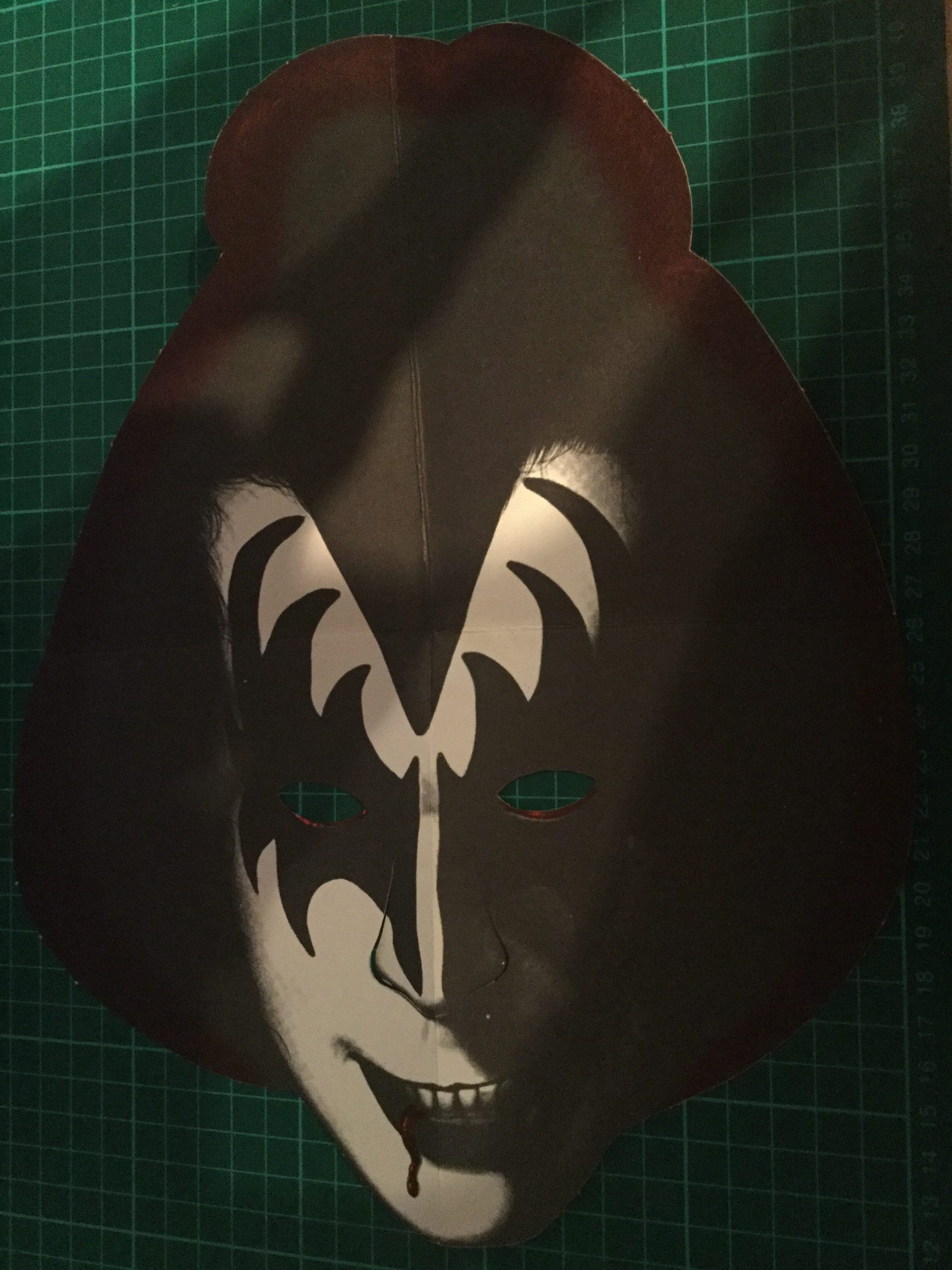 It appears as though there were separate print runs and/or printing plants making Gene masks, resulting in differing colouration on the blood trickle coming from Gene’s mouth.