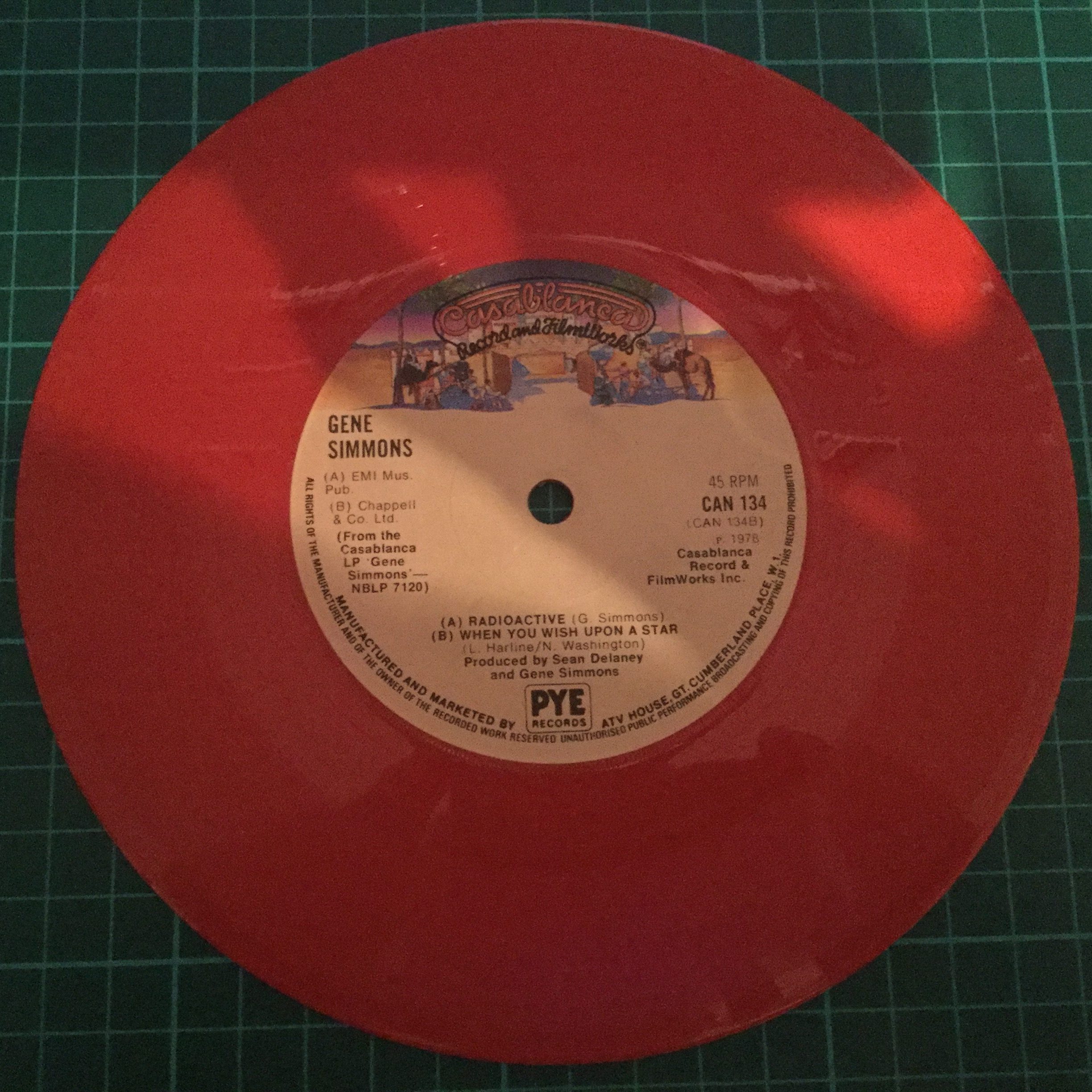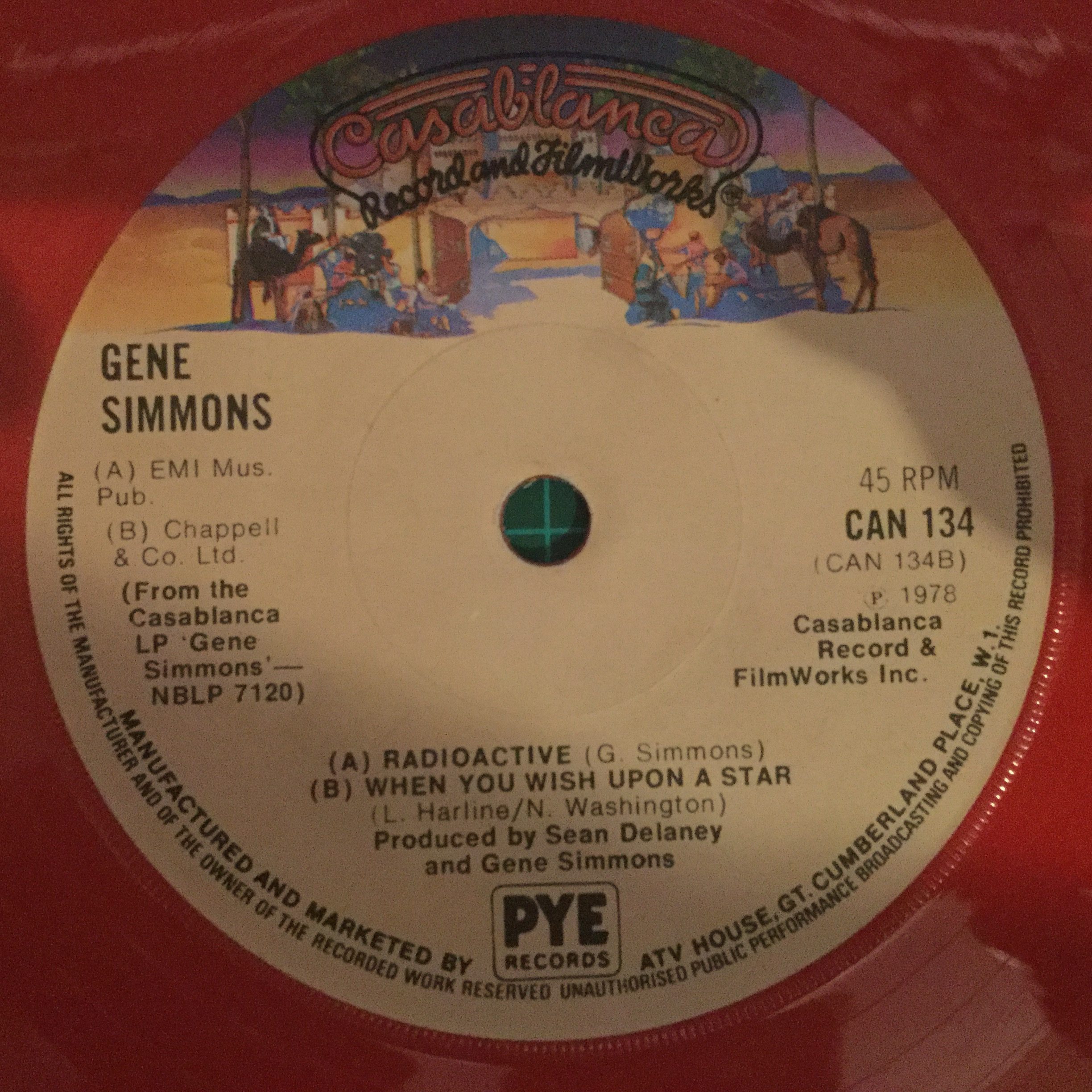 This is the ‘generic’ black vinyl release that those unlucky to have missed out on the picture sleeve and/or red vinyl would get instead, but with a knock-out hole that could be removed so that it could fit a jukebox and comes in a company sleeve, i.e. the brown sleeve with tan Casablanca logo and camel ‘wallpaper’ motif.